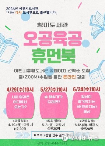 [ 포에버뉴스 김경순 기자 ] 이천시 청미도서관은 이천시 도서관의'나는 다시 도서관으로 출근합니다'와 연계한 '오공육공 휴먼북'을 운영한다. 이번 행사는 은퇴 세대의 풍부한 사회 경험과 전문 지식을 지역사회의 교육 자원으로 활용하고 청소년과 청년과의 소통을 통해 지역 멘토로서의 역할을 확대하고자 기획됐다.