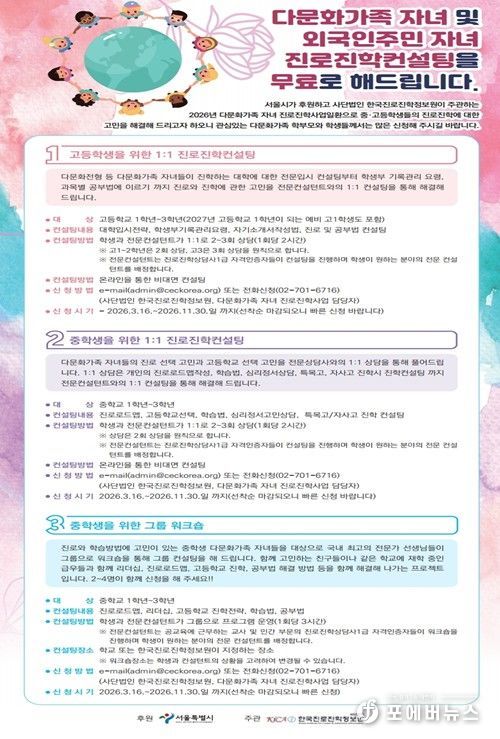 서울시는 부모 또는 학생 본인이 외국 국적이거나 외국 국적을 가진 적이 있는 학생을 의미하는 이주배경 청소년들을 위한 진로 설계와 대학 진학을 지원하는'다문화가족 자녀 진로·진학 지원사업'을 올해 확대 추진한다고 밝혔다. 본 사업은 2014년부터 시작되어 12년간 운영된 서울시 대표 다문화 청소년 지원사업으로, 올해부터 축적된 상담 데이터를 기반으로 개인별 진로경로 설계(ICP, Individual Career Pathway)를 도입한다.