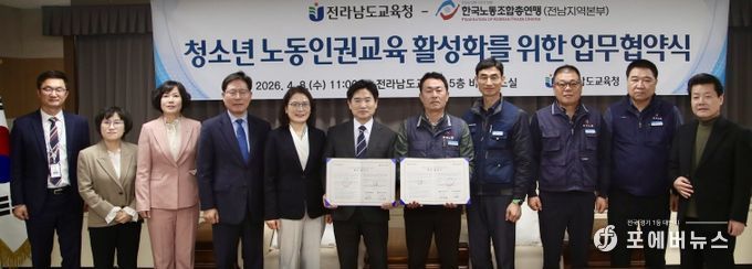 [ 포에버뉴스 오명숙 기자 ] 전라남도교육청은 4월 8일 청사 5층 비즈니스실에서 한국노동조합총연맹 전남본부와 ‘청소년 노동인권 보호·증진’을 위한 업무협약을 체결했다.