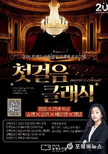 [ 포에버뉴스 김경순 기자 ] 부평구립 부개도서관은 오는 5월 영화와 클래식 음악을 결합한 인문 프로그램 ‘첫걸음 클래식: 영화가 건넨 위로’를 운영한다.
