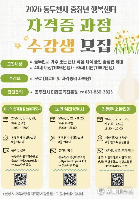 [ 포에버뉴스 김경순 기자 ] 동두천시 미래교육진흥원은 지역 내 중장년층의 성공적인 인생 2막과 안정적인 사회 참여를 지원하기 위해 ‘2026년 중장년 행복센터 자격증 과정’ 수강생을 모집한다고 밝혔다.