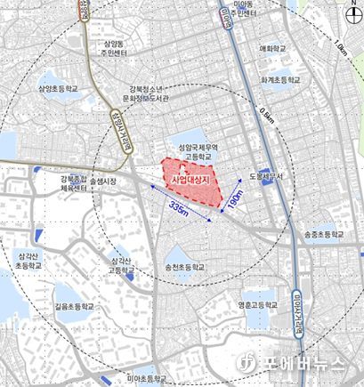 대상지는 역세권(삼양사거리역 반경 180m, 미아사거리역 반경 580m) 및 중심지 배후주거지로, 솔샘로에 면한 우수한 입지에도 불구하고 수십 년간 가로구조를 유지한 채 주거환경 노후화가 지속됐다.