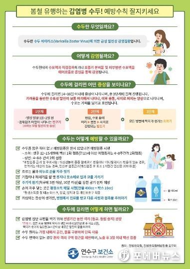 보건소 관계자는 “최근 학교를 중심으로 수두 발생이 증가하고 있어 학부모의 각별한 관심이 필요하다.”라며 “손 씻기 등 예방 수칙 준수에 동참해 주시길 바라며, 의심 증상이 있는 경우 신속히 진료받고 증상이 사라질 때까지 등교를 자제해야 한다.”라고 말했다.