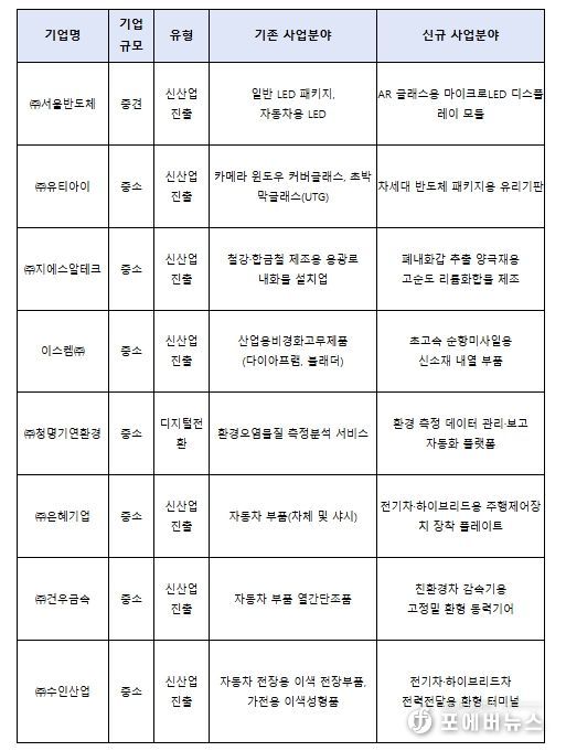 사업재편계획 승인기업의 사업재편계획은 다음과 같다. 디스플레이 부품사인 ㈜서울반도체는 마이크로LED 원천기술을 바탕으로 AR글래스용 디스플레이 모듈 시장에 진출하고, ㈜유티아이는 초박막 글래스 등을 제조하는 고정밀 유리제조기술을 활용하여 반도체 패키지용 유리기판 사업에 진출한다. ㈜지에스알테크는 철강 용광로 내화물(벽돌 등) 시공업에서 이차전지 양극재 생산 후 폐기되는 내화물에서 리튬을 추출·재활용해 양극재 원료를 공급한다. ㈜건우금속은 내연기관차 베어링·변속기 부품 제조기술에 인공지능 자율제조모델을 도입하는 제조공정 고도화를 통해 전기차용 환형 동력기어를 개발한다.