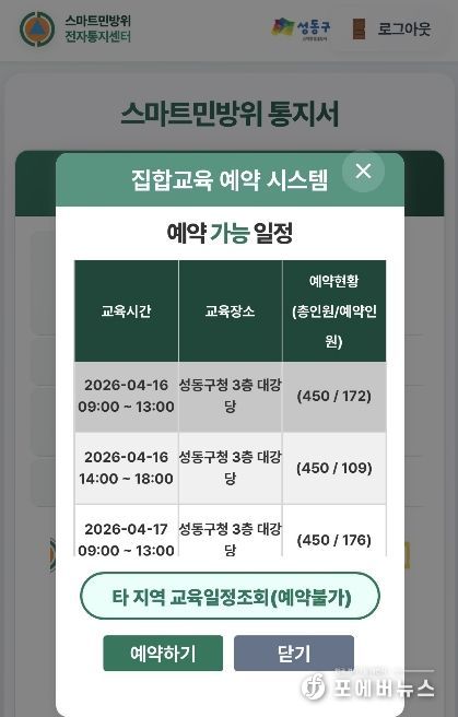 교육 대상은 성동구 소속 민방위 대원 및 민방위 대장으로, 1~2년 차 대원은 4월 16일부터 4월 29일까지 성동구청 3층 대강당에서 4시간 집합교육을 이수해야 하며, 3년 차 이상 대원은 4월 16일부터 6월 30일까지 스마트민방위교육에 접속하여 사이버교육을 1~2시간 받아야 한다.