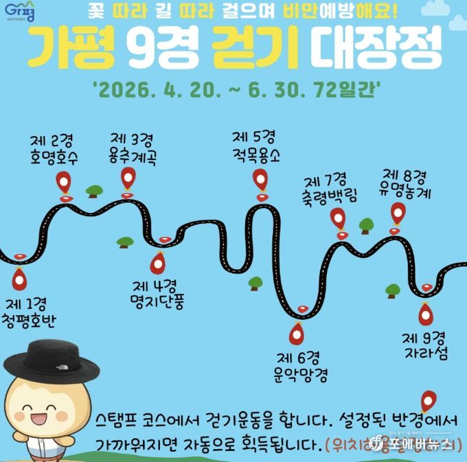 [ 포에버뉴스 김경순 기자 ] 가평군의 수려한 자연경관을 배경으로 건강을 다지는 ‘2026 가평 9경 걷기 대장정’이 오는 20일부터 시작된다. 가평군보건소는 군민들의 비만을 예방하고 걷기 실천율을 높이기 위해 이번 프로그램을 마련했다고 15일 밝혔다.