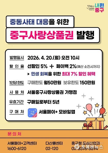 [ 포에버뉴스 김경순 기자 ] 서울 중구가 중동전쟁으로 인한 경기 불안과 소비 위축에 대응하기 위해 20억 원 규모의 '서울중구사랑상품권'을 오는 20일 발행한다.