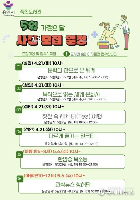 [ 포에버뉴스 김경순 기자 ] 용인특례시 죽전도서관은 오는 5월 가정의 달을 맞아 ‘2026년 5월 독서문화행사’를 개최한다.