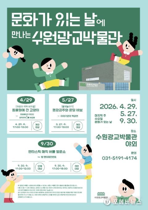 수원광교박물관 관계자는 “이번 공연은 어린이에게는 꿈과 즐거움을, 가족에게는 소중한 추억을 선사하기 위해 마련했다”며 “시민이 일상에서 문화를 누릴 수 있도록 다양한 프로그램을 지속해서 운영하겠다”고 말했다.
