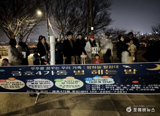 [ 포에버뉴스 김경순 기자 ] 서울 성동구 금호4가동에서는 지난 3월 14일부터 4월 3일까지 총 4회에 걸쳐 진행된 주민참여예산 사업 '별 헤는 밤' 프로그램이 주민들의 뜨거운 호응 속에 성공적으로 마쳤다고 밝혔다.