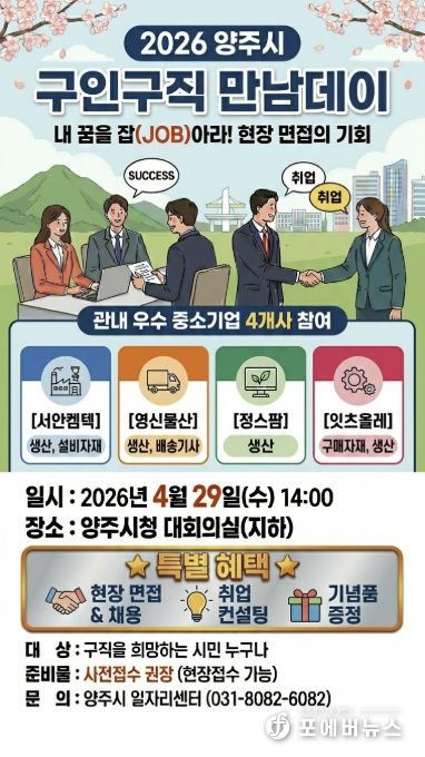 행사는 오는 4월 29일 오후 2시부터 4시까지 양주시청 대회의실에서 진행되며, 구직자는 사전 신청 또는 행사 당일 오후 1시 30분부터 현장 접수 후 면접에 참여할 수 있다. 참여를 희망하는 구직자는 이력서 등 지원 서류를 지참해야 한다.