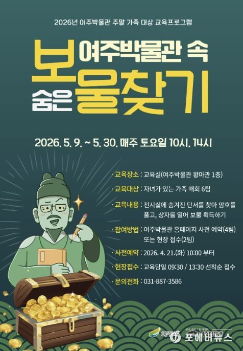 [ 포에버뉴스 김경순 기자 ] 여주시 여주박물관은 가정의 달 5월을 맞아 가족이 함께 지역 문화유산의 가치를 즐겁게 배우고 체험할 수 있는 ‘여주박물관 속 숨은 보물찾기’를 운영한다.