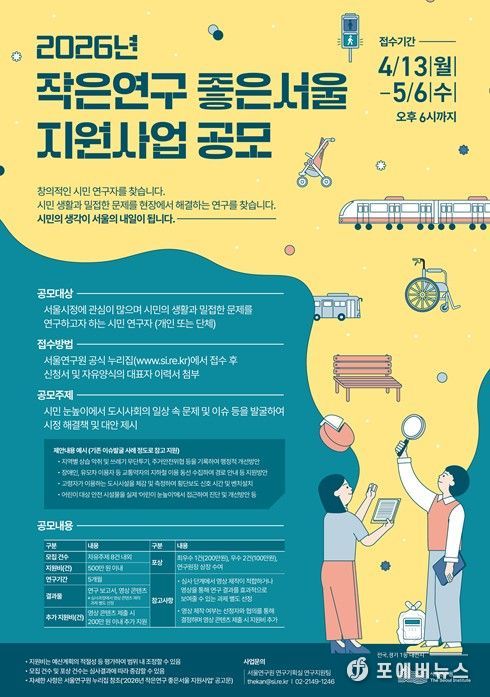 [ 포에버뉴스 김경순 기자 ] 서울연구원은 4월 13일~5월 6일까지 '2026년 작은연구 좋은서울 지원사업' 공모를 진행한다고 밝혔다.