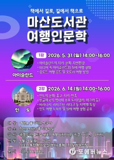 [ 포에버뉴스 김경순 기자 ] 김포시 마산도서관이 오는 5월 31일과 6월 14일 오후 2시부터 4시까지 다목적실에서 여행 인문학 강연 ‘책에서 길로, 길에서 책으로’를 운영한다.
