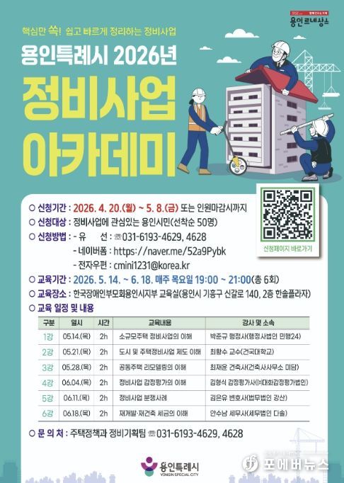 [ 포에버뉴스 김경순 기자 ] 용인특례시는 4월 20일부터 5월 8일까지 ‘2026년 정비사업 아카데미’ 수강생을 모집한다.