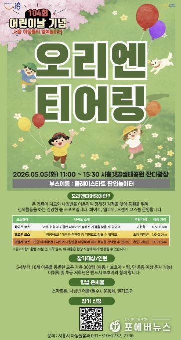 [ 포에버뉴스 김경순 기자 ] 시흥시는 제104회 어린이날을 맞아 5월 5일 갯골생태공원 잔디광장에서 아동과 가족이 함께 즐길 수 있는 ‘5월 플레이스타트 팝업놀이터’를 운영한다. 이번 행사는 시흥시 어린이날 기념행사의 하나로 마련돼 행사장을 찾은 가족들에게 다채로운 프로그램으로 즐거움을 선사할 예정이다.