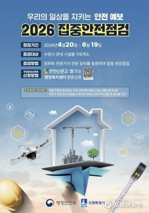 [ 포에버뉴스 김경순 기자 ] 수원특례시가 안전사고를 예방하고, 시민의 안전 의식을 고취하기 위해 20일부터 6월 19일까지 ‘2026년 집중안전점검’을 한다.