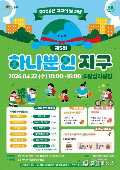 [ 포에버뉴스 김경순 기자 ] 서울 성동구는 오는 4월 22일 왕십리광장에서 기후위기의 심각성을 알리고 탄소중립 실천 문화를 확산하기 위한 ‘제5회 하나뿐인 지구’ 행사를 개최한다고 밝혔다.