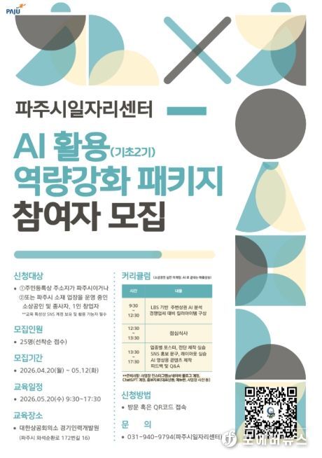 모집 기간은 4월 20일부터 5월 12일까지이며, 교육은 5월 20일 경기인력개발원에서 하루 7시간 과정으로 진행된다. 모집 대상은 파주시 관내 소상공인으로, 총 25명을 선착순 모집한다. 자세한 사항은 파주시청 누리집을 참고하거나 파주시 일자리센터로 문의하면 상세히 안내받을 수 있다.