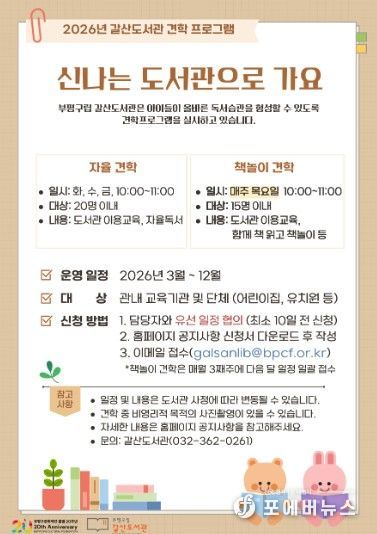 [ 포에버뉴스 김경순 기자 ] 부평구립 갈산도서관은 지역 내 교육기관을 대상으로 운영 중인 견학 프로그램 ‘신나는 도서관으로 가요’를 오는 5월부터 확대 운영한다.