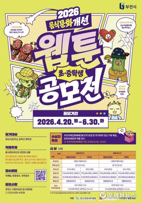 [ 포에버뉴스 김경순 기자 ] 부천시는 4월 20일부터 6월 30일까지 ‘2026년 음식문화개선 초중학생 웹툰·캐릭터 공모전’을 연다. 이번 공모전은 학생들이 일상 속 음식문화를 주제로 직접 창작에 참여함으로써 올바른 식문화에 대한 인식을 높이기 위해 매년 추진되고 있다.