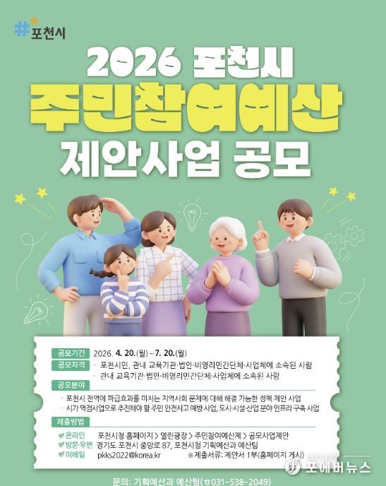 [ 포에버뉴스 김경순 기자 ] 포천시가 4월 20일부터 오는 7월 20일까지 2027년도 예산편성을 위한 주민참여예산 공모제안사업을 접수하고 있다.