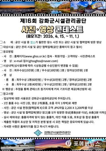 [ 포에버뉴스 김경순 기자 ] 강화군시설관리공단이 ‘제16회 강화군시설관리공단 사진·영상 콘테스트’를 개최한다.