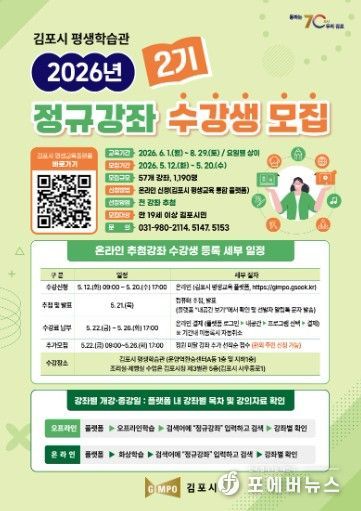 [ 포에버뉴스 김경순 기자 ] 김포시가 시민의 평생학습 참여 기회를 확대하고 변화하는 사회 환경에 대응할 수 있는 역량 강화를 위해 ‘2026년 2기 평생교육 정규강좌’ 수강생을 모집한다고 밝혔다.