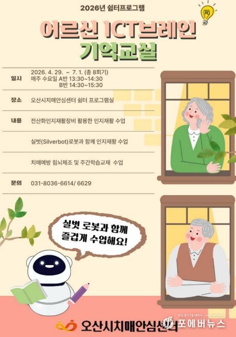 [ 포에버뉴스 김경순 기자 ] 오산시치매안심센터는 오는 4월 29일부터 경증 치매환자를 위한 쉼터 프로그램 ‘ICT 브레인 기억 교실’을 운영한다고 밝혔다.