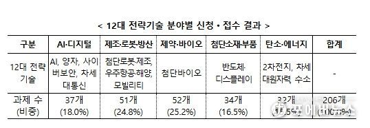 이번 공모는 12대 전략기술 분야를 중심으로 진행된 이번 공모는, 5대 전략기술 그룹 단위로는 제약·바이오 분야에 52개(25.2%), 제조·로봇·방산에 51개(24.8%), 인공지능(이하 AI)·디지털에 37개(18.0%) 등이 접수됐으며, 총 206개 접수 과제에 1,183개 기업·연구소 등이 참여 신청했다.