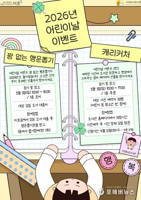 [ 포에버뉴스 김경순 기자 ] 서울 서초구는 다가오는 어린이날을 맞아 다음달 3일 서초청소년도서관에서 어린이와 가족 모두가 즐길 수 있는 특별한 문화 행사를 개최한다. 이용자들을 위한 이벤트를 중심으로 일상 속 친숙한 도서관 만들기의 일환이다.