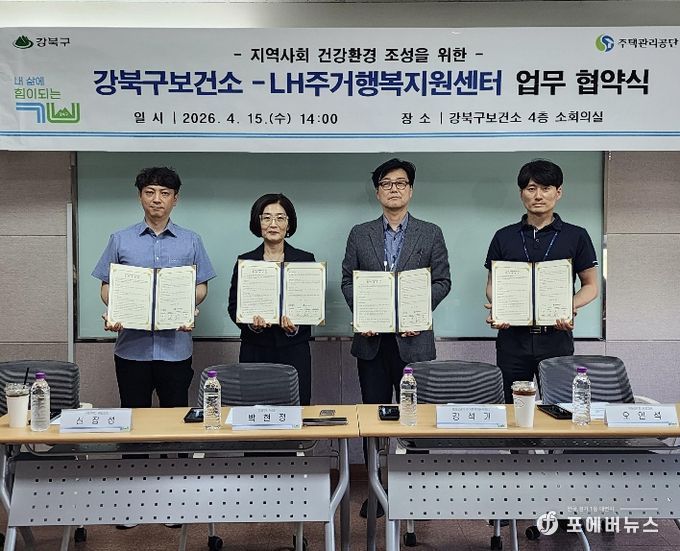 [ 포에버뉴스 김경순 기자 ] 서울 강북구는 지난 15일 강북구보건소에서 번동2·3·5단지 LH주거행복지원센터와 지역사회 건강환경 조성을 위한 업무협약(MOU)을 체결했다고 밝혔다.
