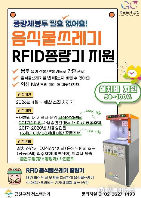 [ 포에버뉴스 김경순 기자 ] 금천구는 생활폐기물 직매립이 금지됨에 따라 음식물쓰레기 혼합배출을 예방하고 배출량을 줄이기 위해 2026년 음식물쓰레기 자동계량장비(RFID) 종량기 설치 지원을 신청받는다고 밝혔다.