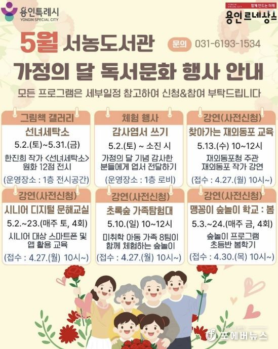 [ 포에버뉴스 김경순 기자 ] 용인특례시 서농도서관은 오는 5월 가정의 달을 맞아 다양한 세대를 아우르는 프로그램으로 이뤄진 ‘2026년 5월 독서문화행사’를 마련했다고 21일 밝혔다.