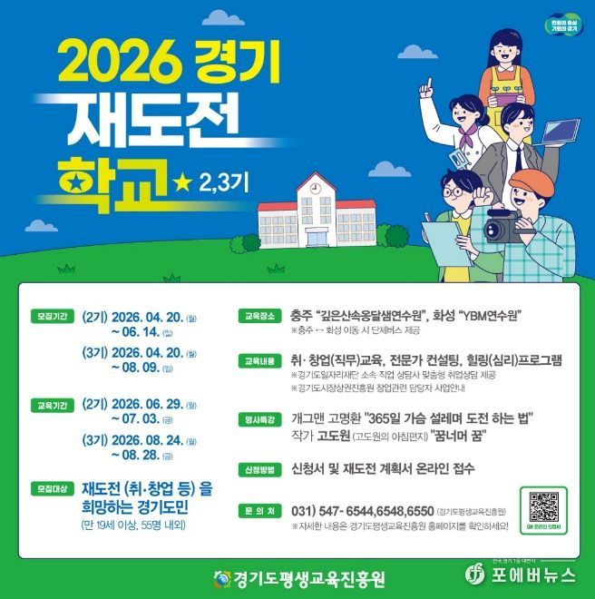 [ 포에버뉴스 김경순 기자 ] 경기도와 경기도평생교육진흥원은 취업이나 창업 실패를 경험한 도민의 재기를 지원하기 위해 오는 20일부터 ‘2026년 경기 재도전학교’ 2~3기 참가자를 각각 55명 내외로 모집한다.