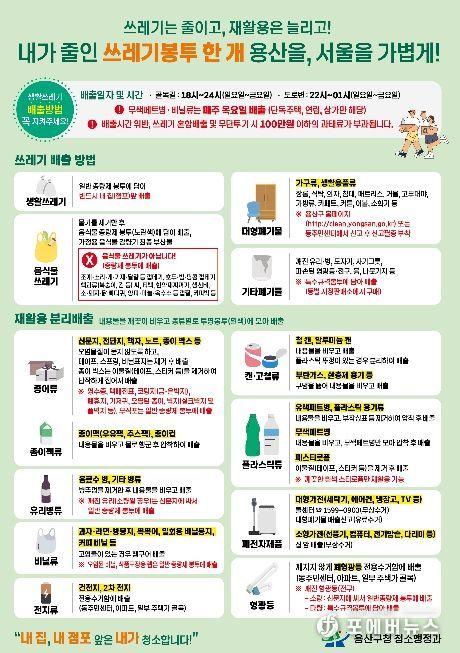 [ 포에버뉴스 김경순 기자 ] 서울 용산구가 주민 누구나 생활쓰레기 분리배출 정보를 쉽게 이해하고 실천할 수 있도록 주요 배출 정보를 한 장에 담은 안내문을 제작·배포한다.