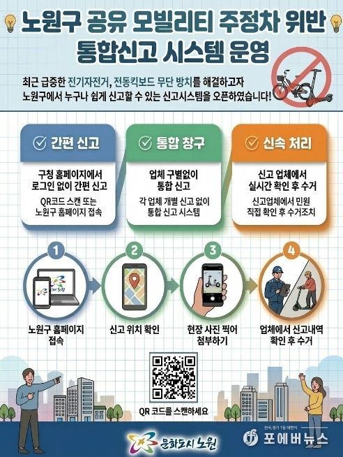 오승록 노원구청장은 “이번 통합 신고시스템 구축은 무단 방치된 공유 모빌리티로 인한 주민 불편을 최소화하기 위한 선제적 조치”라며, “앞으로도 쾌적한 도시 미관을 조성하고, 구민 누구나 안심하고 걸을 수 있는 안전한 보행환경을 만드는 데 최선을 다하겠다”라고 말했다.