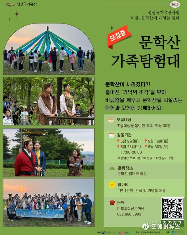 한편, ‘문학산 가족탐험대’는 국가유산청과 미추홀구가 주최하고 미추홀학산문화원이 주관하며, 인천광역시가 후원하는 2026 생생 국가유산 사업 ‘비류, 문학산에 내일을 품다’의 일환으로 운영된다.
