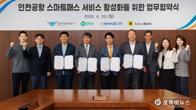 [ 포에버뉴스 김경순 기자 ] 인천국제공항공사는 인천공항의 안면인식 출국 서비스인 ‘스마트패스’의 등록 채널을 확대하기 위해 네이버페이, NH농협은행, 카카오뱅크와 ‘스마트패스 서비스 활성화 업무협약’을 체결했다고 21일 밝혔다.
