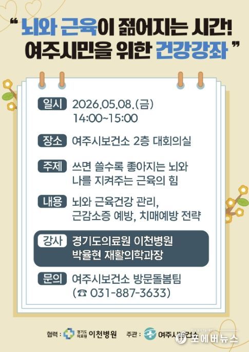 [ 포에버뉴스 김경순 기자 ] 여주시보건소 건강증진과는 오는 5월 8일 오후 2시, 보건소 2층 대회의실에서 여주시민을 위한 건강강좌 '뇌와 근육이 젊어지는 시간!'을 개최한다고 밝혔다.