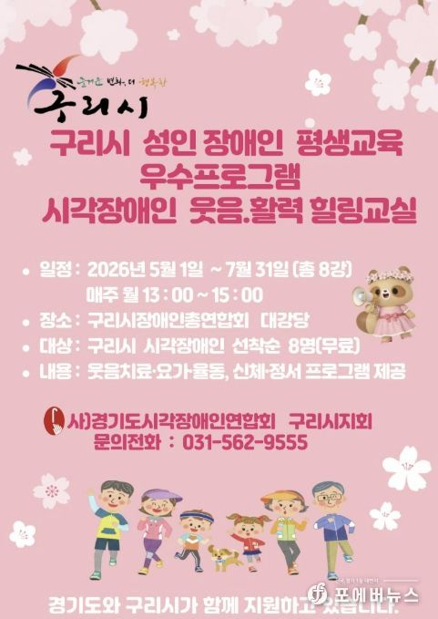 [ 포에버뉴스 김경순 기자 ] 사단법인 경기도시각장애인연합회 구리시지회는 구리시와 경기도의 지원을 받아 2026년 5월부터 ‘시각장애인 웃음·활력 힐링 교실’을 운영할 예정이라고 밝혔다.