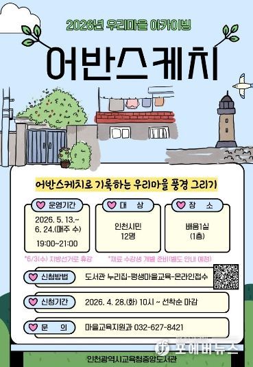 [ 포에버뉴스 김경순 기자 ] 인천광역시교육청중앙도서관은 2026년도 마을교육 아카이빙 사업의 일환으로, 5월 13일부터 ‘우리 마을 아카이빙, 어반스케치’ 프로그램을 운영한다.