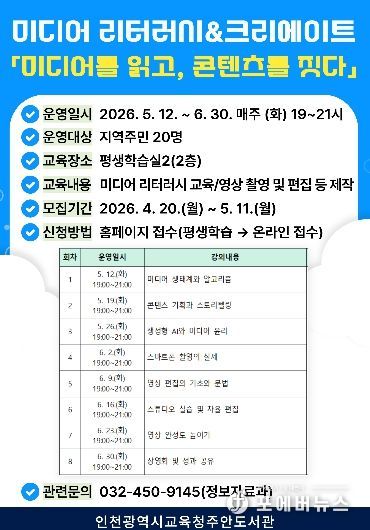 [ 포에버뉴스 김경순 기자 ] 인천광역시교육청주안도서관은 시민의 디지털 역량 강화와 올바른 미디어 활용을 돕기 위해, 5월 12일부터 미디어 리터러시 교육 프로그램 ‘미디어를 읽고, 콘텐츠를 짓다’를 운영한다.