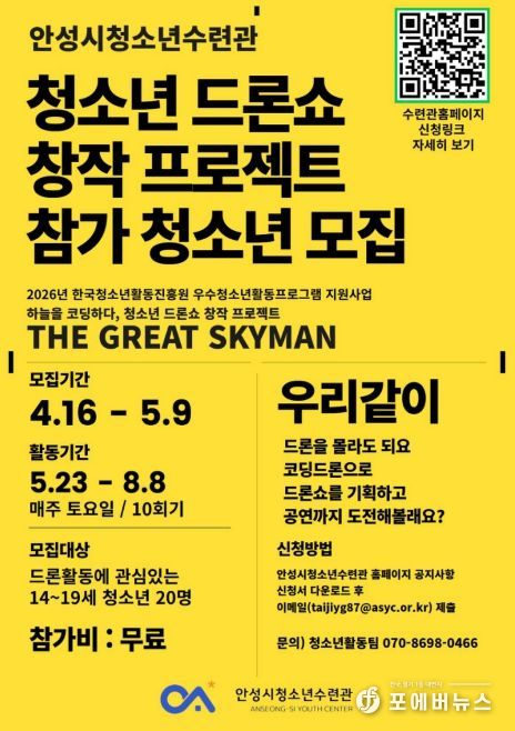 [ 포에버뉴스 김경순 기자 ] 안성시청소년수련관은 미래 디지털 인재 양성을 위한 청소년 참여형 프로그램 '하늘을 코딩하다, 청소년 드론쇼 창작 프로젝트 ‘THE GREAT SKYMAN’'에 참여할 청소년을 4월 16일 ~ 5월 8일까지 모집한다고 밝혔다.