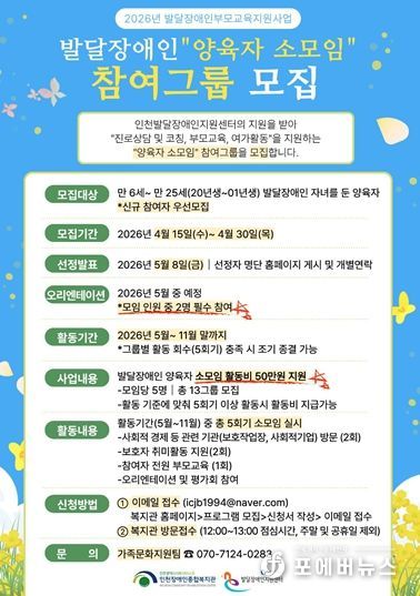 [ 포에버뉴스 김경순 기자 ] 인천시사회서비스원 소속 인천장애인종합복지관은 ‘발달장애인 양육자 소모임’ 참여자를 모집한다고 21일 밝혔다.