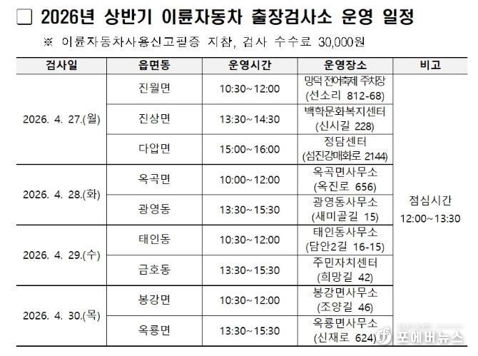 [ 포에버뉴스 오명숙 기자 ] 광양시는 이륜자동차 정기검사의 원활한 추진과 검사소가 없는 지역 주민의 편의를 위해 4월 27일부터 30일까지 한국교통안전공단과 합동으로 2026년 상반기 이륜자동차 출장검사소를 운영한다고 밝혔다.