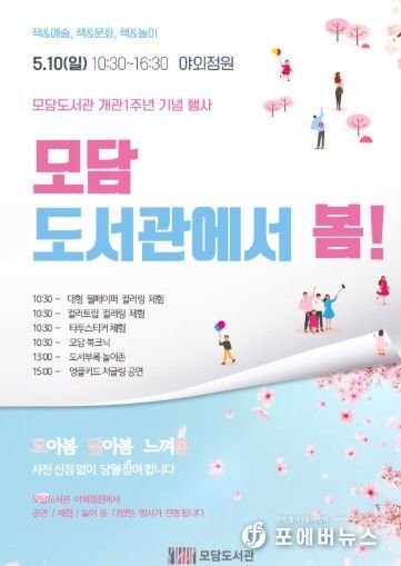 [ 포에버뉴스 김경순 기자 ] 김포 최대 규모 공공도서관인 모담도서관이 개관 1주년을 맞아 오는 5월 10일 ‘책과 문화·예술·놀이’가 어우러지는 행사를 연다. 이번 행사는 시민들에게 감사의 마음을 전하고 복합문화공간으로서의 역할을 수행하고자 마련된 것으로, 사전예약 없이 도서관 방문자 누구나 참여 가능하다.