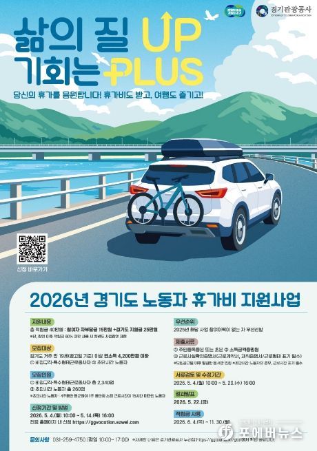 [ 포에버뉴스 김경순 기자 ] 경기도가 경제적 부담으로 휴식을 포기했던 비정규직과 특수형태근로종사자에게 휴가비를 지원하는 ‘취약노동자 휴가비 지원사업’ 참여자를 5월 4일부터 14일까지 모집한다.