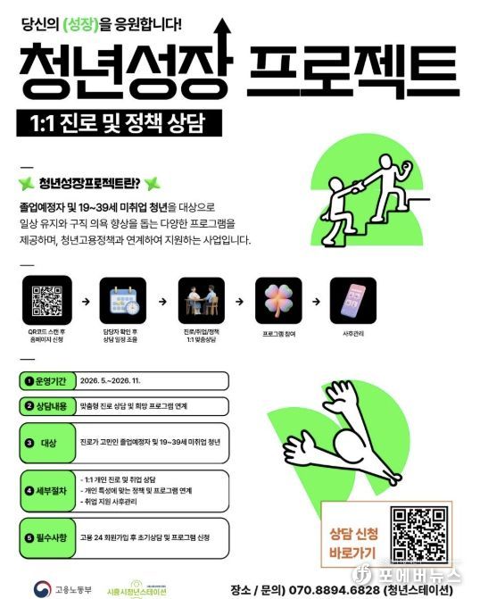 참여 신청은 청년스테이션 현장 또는 ‘고용24’ 누리집 내 청년성장프로젝트 페이지를 통해 가능하다. 프로그램은 5월부터 전문 상담사의 1대1 진단을 바탕으로 개인별 맞춤형 과정으로 운영된다.