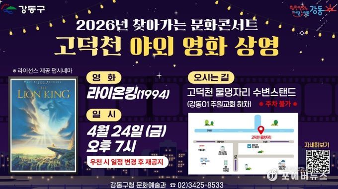 [ 포에버뉴스 김경순 기자 ] 서울 강동구는 오는 24일 오후 7시, 고덕천 물멍자리 수변스탠드(주원교회 맞은편)에서 ‘2026년 찾아가는 문화콘서트’ 3회차 프로그램으로 미디어파사드를 활용한 야외 영화 상영을 진행한다고 밝혔다.